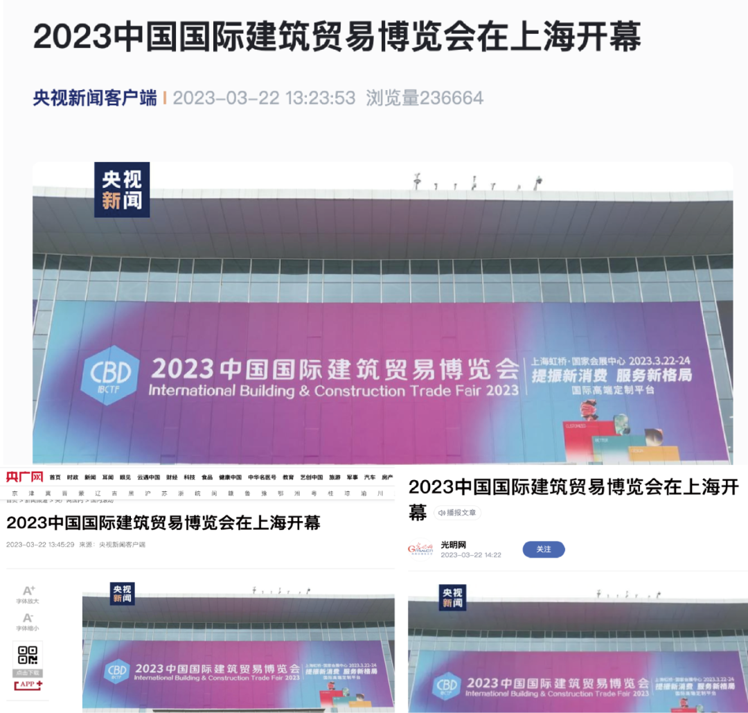 央視新聞、央廣網、光明網、人民視頻、中新社、鳳凰衛視、中國網、東方網 、解放日報、文匯報、新民晚報、每日經濟新聞、界面新聞、觸電新聞、建筑時報、中經網會展、新浪、搜狐、網易、優居、77 度、慧亞、 安居客、居美、九正建材網、搜門網、中國建材網、泛家居圈、家居邦、家頁等主流媒體爭相報道,讓中國建博會(上海)強勢“出圈”,人氣持續高漲,成為行業焦點!